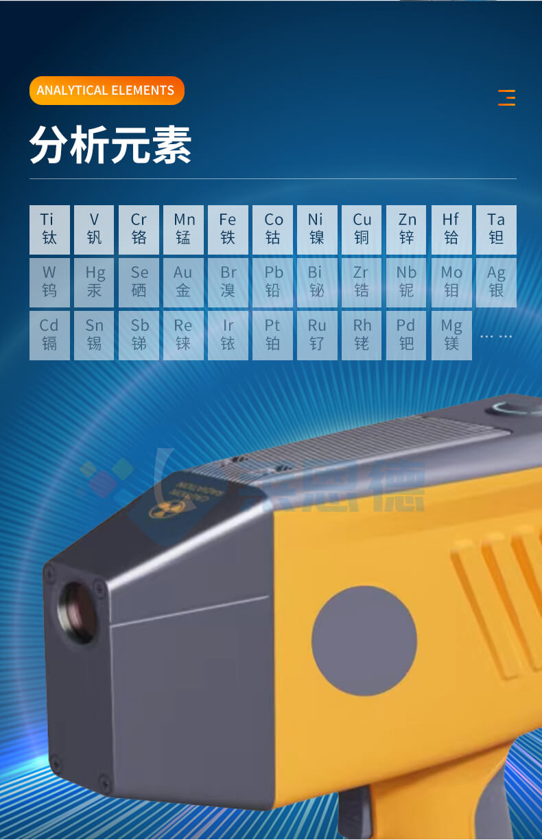| 分析元素 | Ti、V、Cr、Mn、Fe、Co、Ni、Cu、Zn、Hf、Ta、W、Hg、Se、Au、Br、Pb、Bi、Zr、Nb、Mo、Ag、Cd、Sn、Sb、Re、Ir、Pt、Hg、Ru、Rh、Pd等元素 |